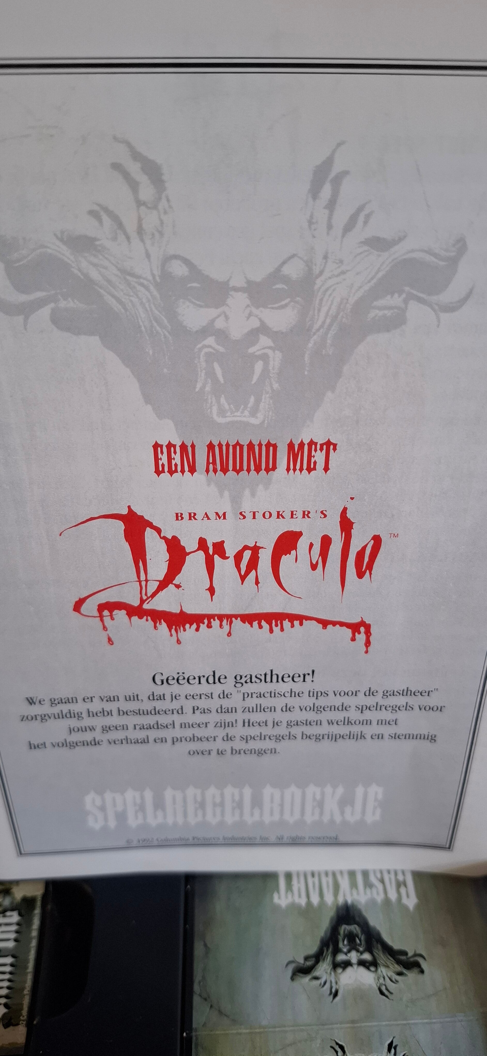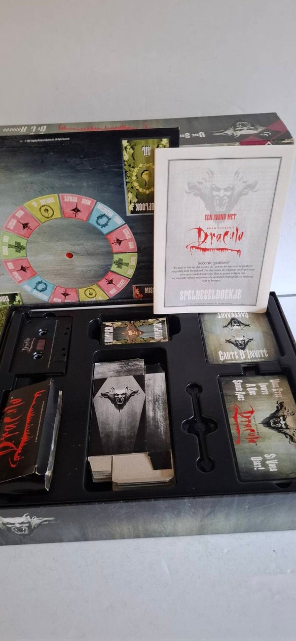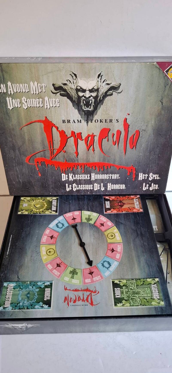 Dit is het vintage bordspel "Een Avond Met Bram Stoker's Dracula" (Frans: Une Soirée Avec Dracula), uitgebracht in 1992 door de uitgever Zebra (of Blue Zebra/Fun Connection).