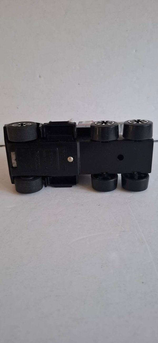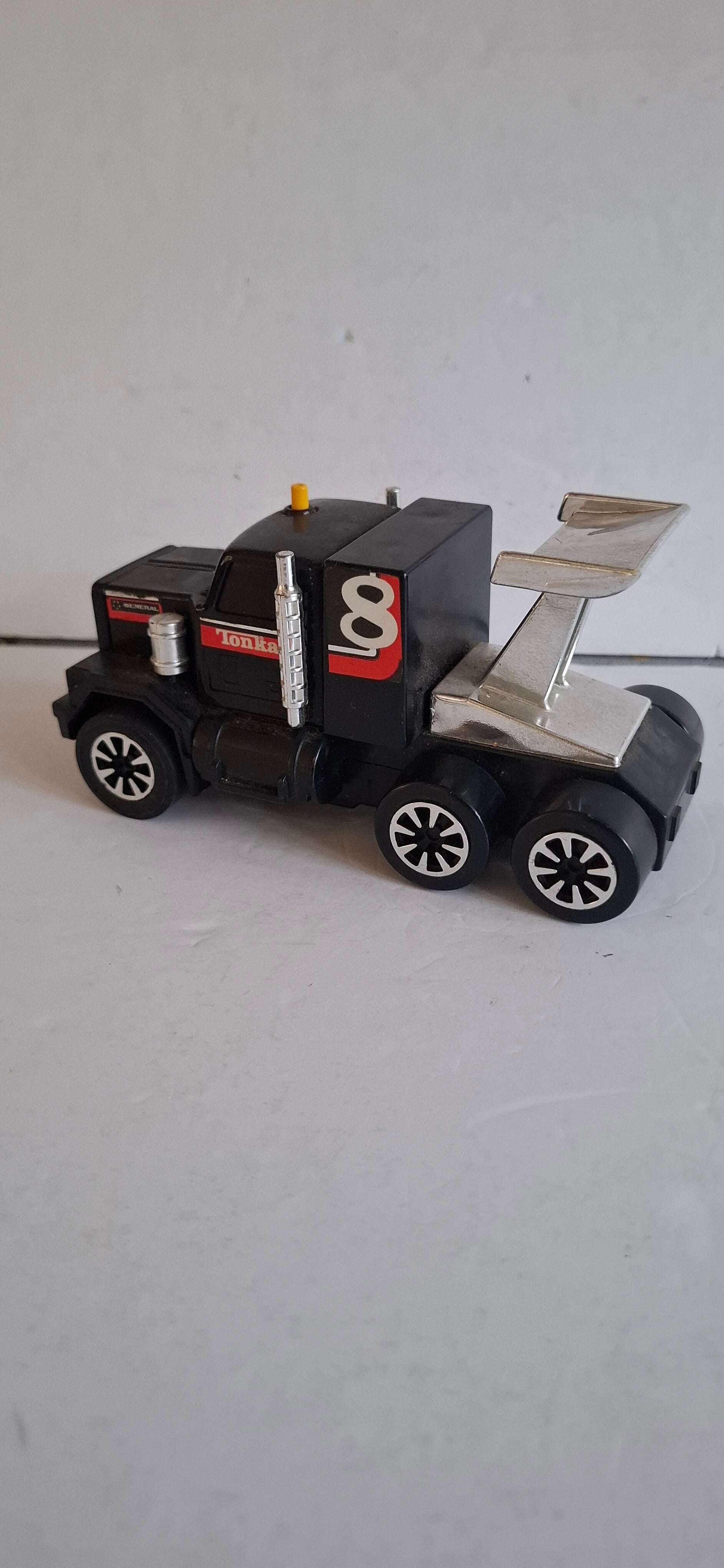 Dit is een vintage Tonka GMC "Clutch Poppers" Big Rig speelgoedvrachtwagen uit het begin van de jaren 80. Het model staat bekend als de "Racing Rig" of "Semi Drag Racer" en is herkenbaar aan de zwarte kleur, het nummer "8" op de cabine en de opvallende zilverkleurige achterspoiler.
