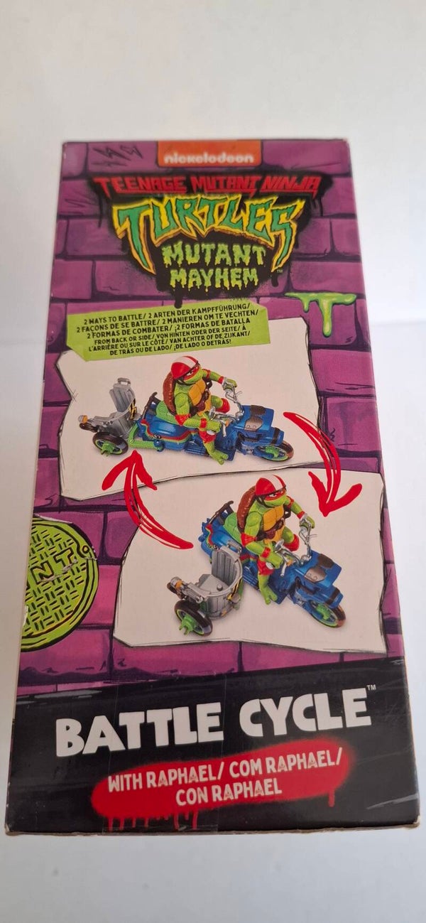 Teenage Mutant Ninja Turtles Mutant Mayhem Battle Cycle met een exclusief actiefiguur van Raphael. Dit speelgoed is gebaseerd op de film Mutant Mayhem (in Nederland bekend als Totale Chaos) uit 2023.
