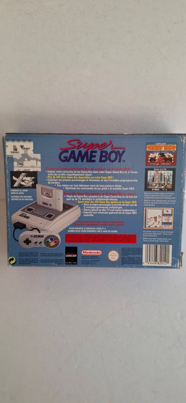 Dit specifieke exemplaar is de FAH/FRA-versie, herkenbaar aan de Franse en Nederlandse tekst op de doos ("Speel alle Game Boy spellen op de Super NES in kleur!").