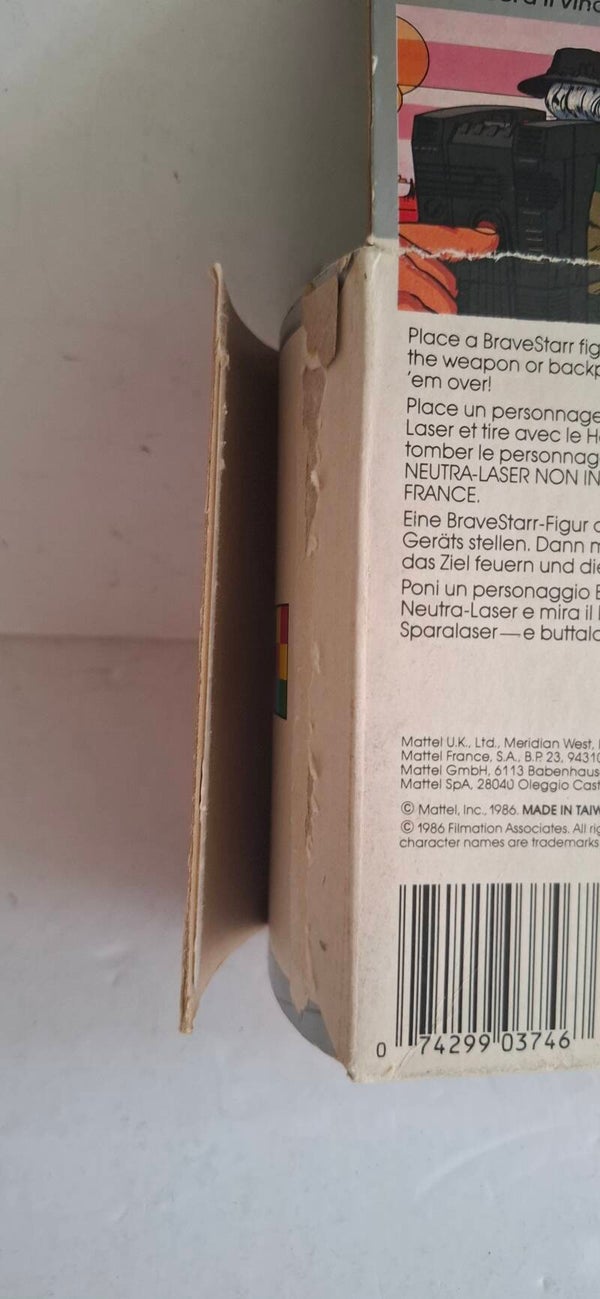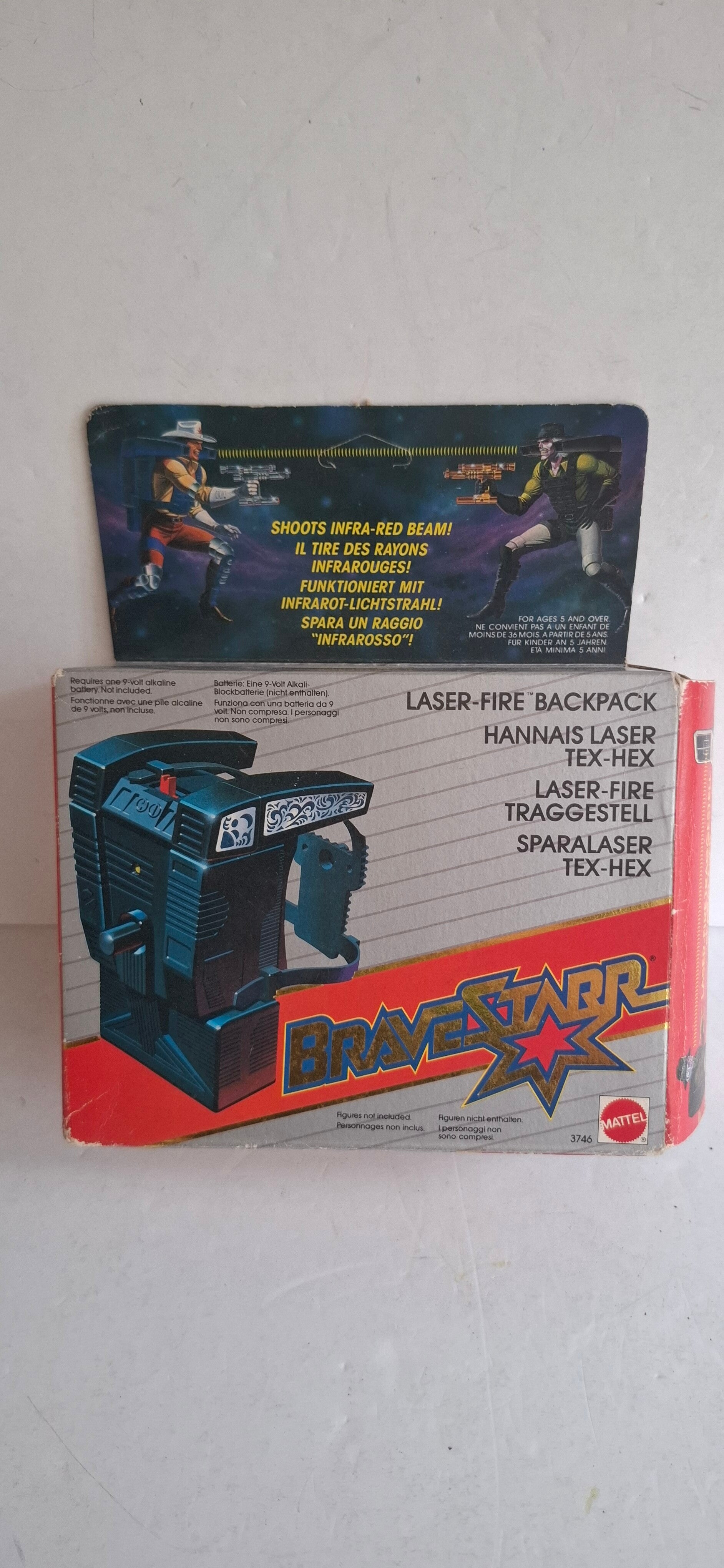 vintage Bravestarr Laser-Fire Backpack van Mattel, geproduceerd rond 1986. Dit specifieke model is ontworpen voor het personage Tex-Hex, de antagonist uit de animatieserie.
