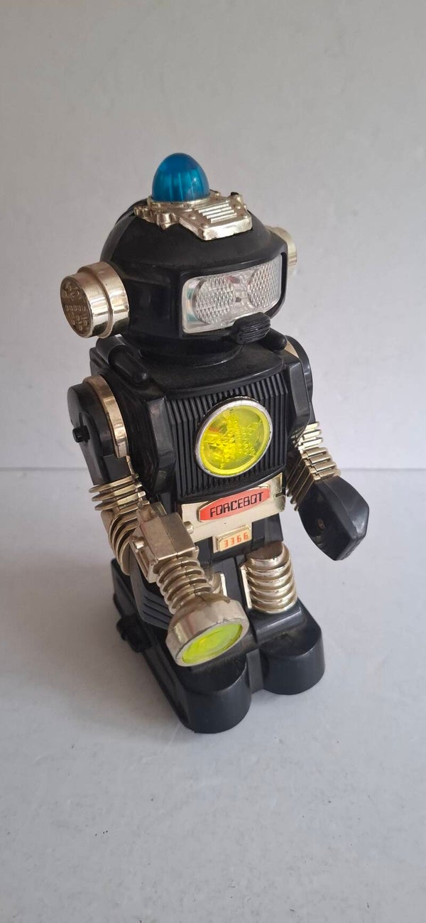Forcebot (modelnummer 3366), een vintage speelgoedrobot die oorspronkelijk in 1985 werd uitgebracht. Dit verzamelobject is gemaakt van plastic en is ongeveer 20,5 tot 22 cm hoog.