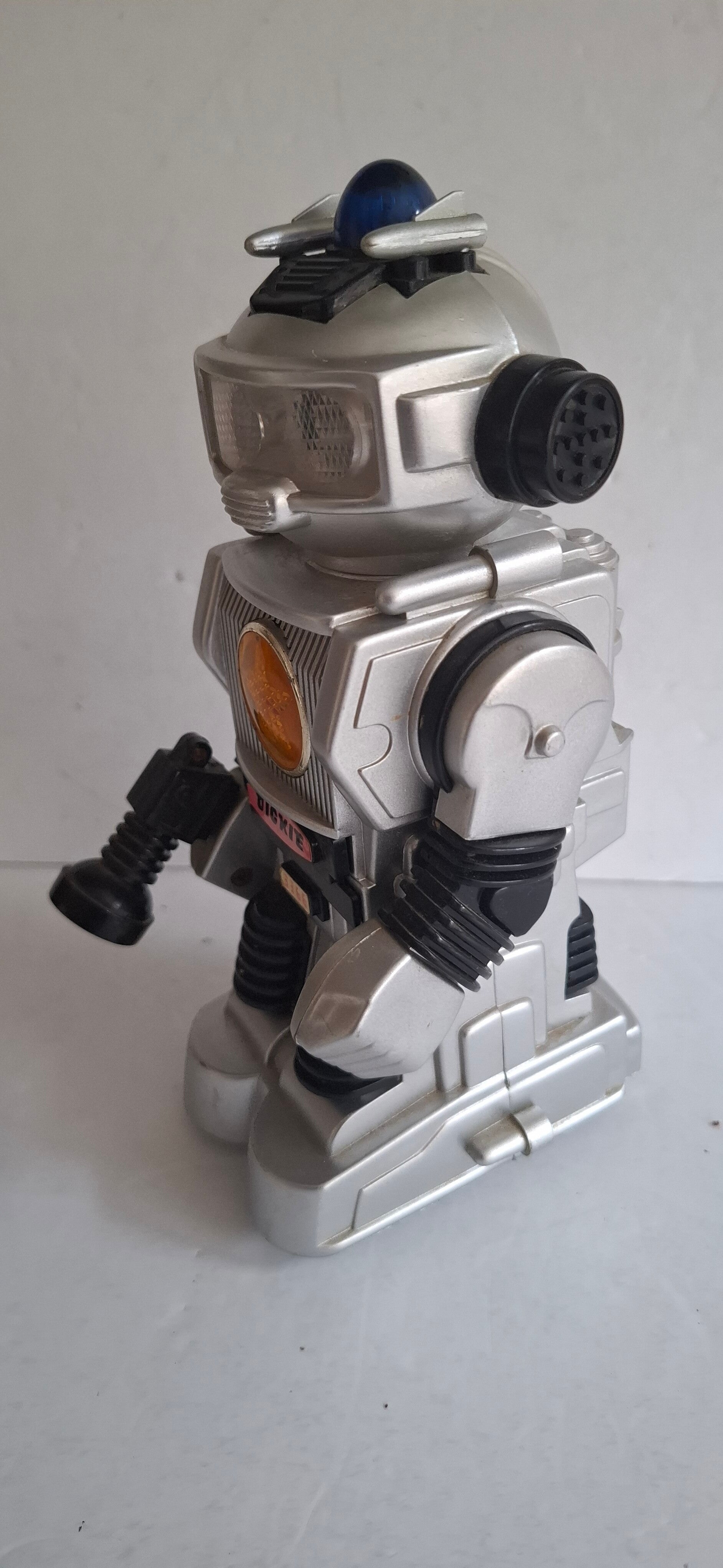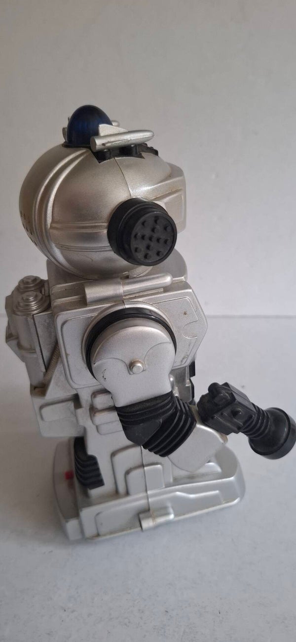Functies: Indien werkend, beschikt de robot over "bump and turn"-actie (hij draait om als hij ergens tegenaan botst), bewegende armen, knipperende lichten en een afneembaar laserpistool.