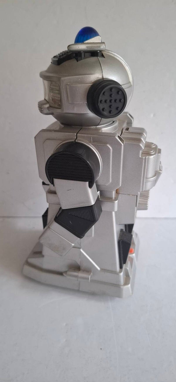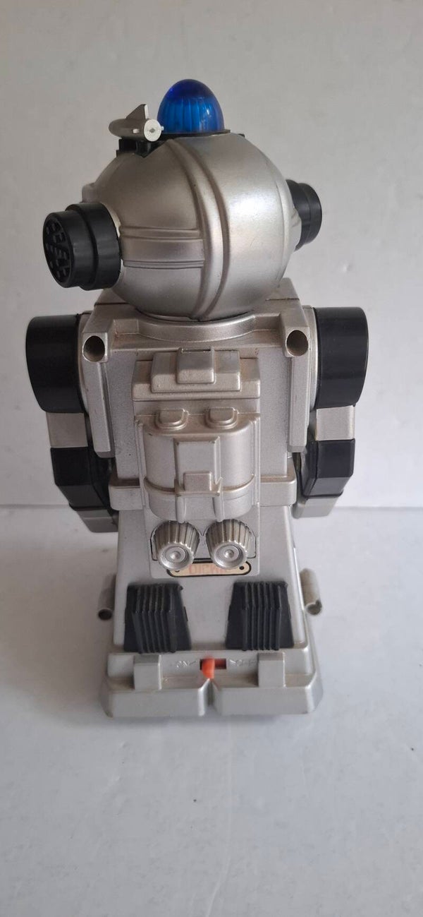 Functies: Indien werkend, beschikt de robot over "bump and turn"-actie (hij draait om als hij ergens tegenaan botst), bewegende armen, knipperende lichten en een afneembaar laserpistool.