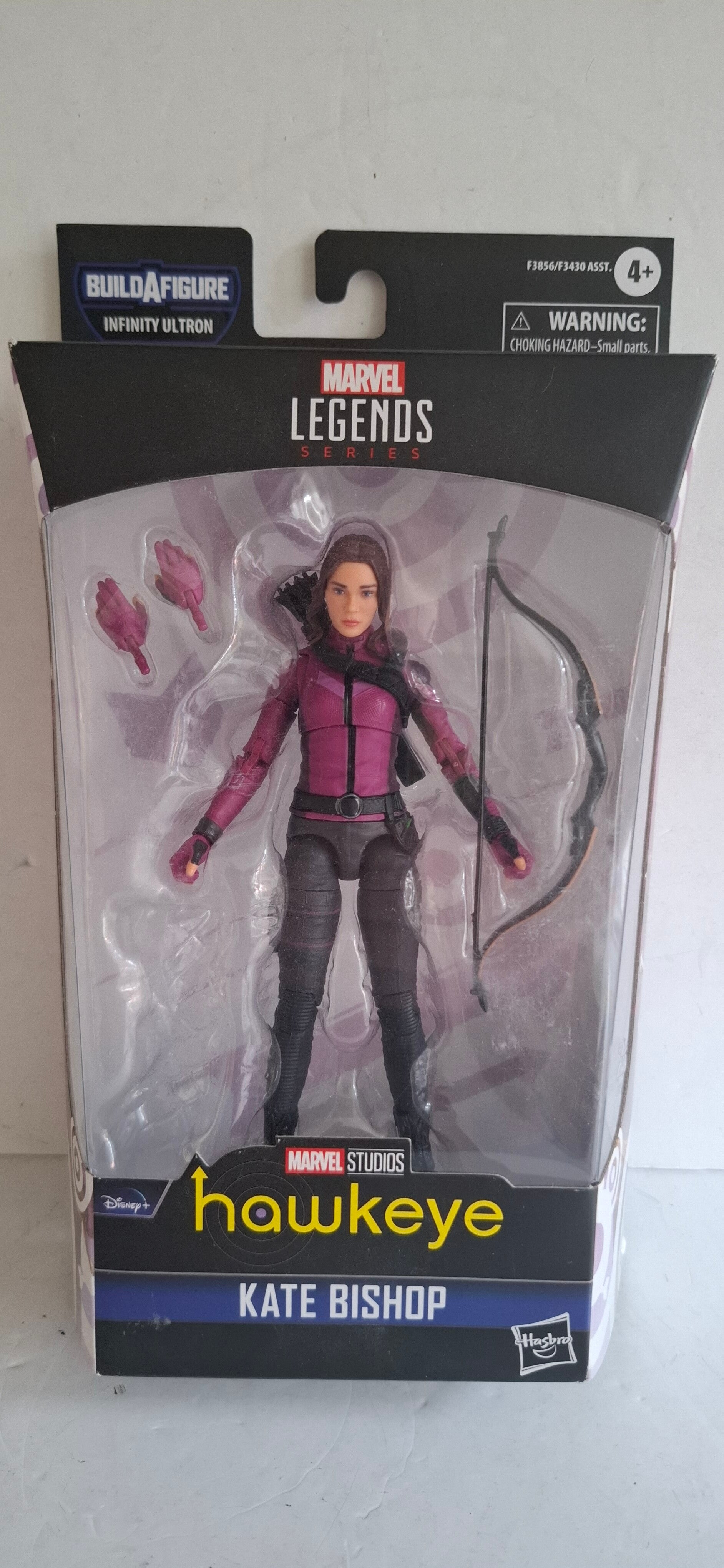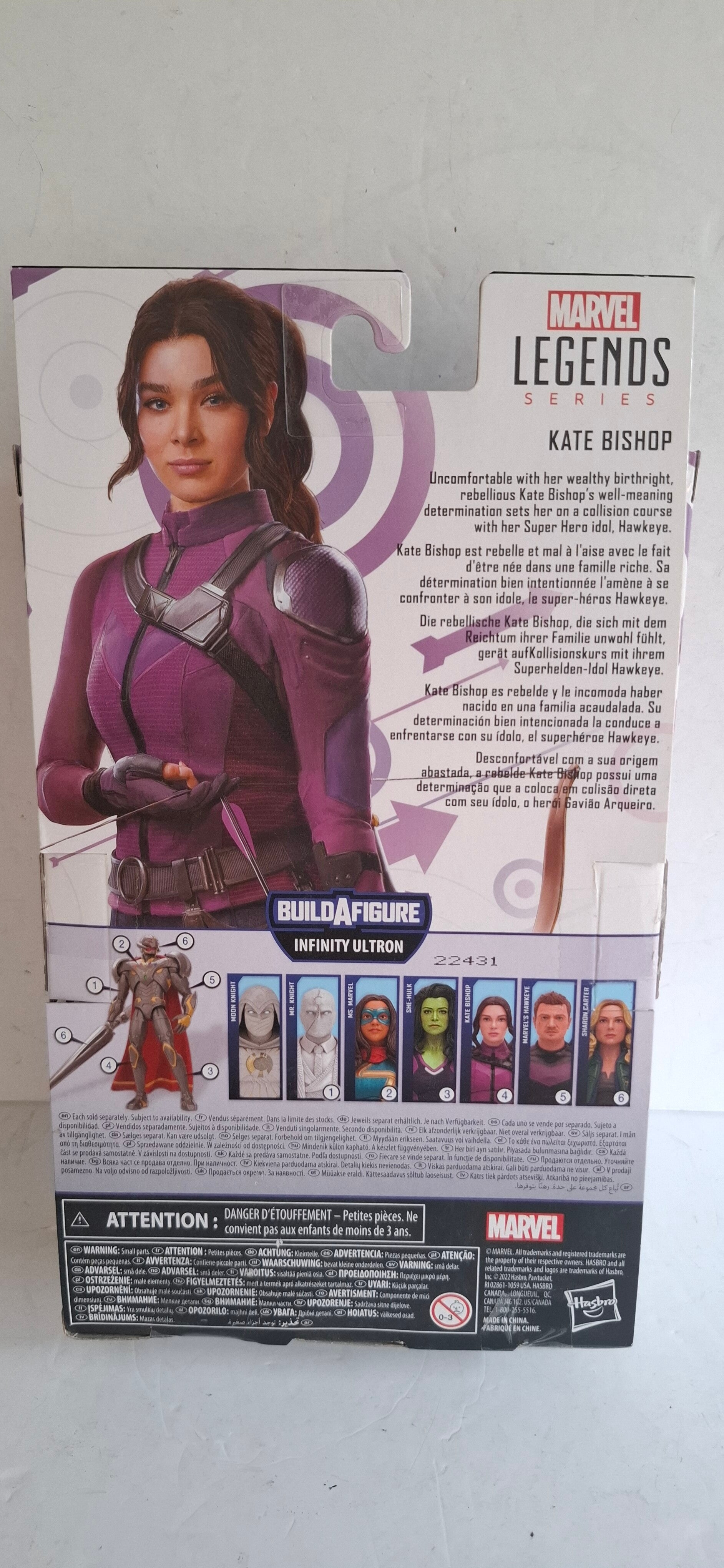 Marvel Legends Kate Bishop actiefiguur van Hasbro, gebaseerd op haar verschijning in de Disney+ serie Hawkeye. Deze 6-inch (ongeveer 15 cm) figuur maakt deel uit van de Infinity Ultron Build-A-Figure serie, wat betekent dat het een onderdeel bevat om een grotere Ultron-figuur in elkaar te zetten.